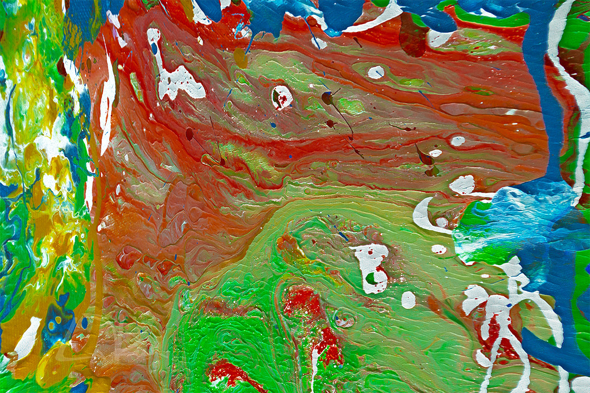 Vibrant colors swirl together in an abstract design, featuring a central area of green with red accents surrounded by dynamic blues and earth tones. The composition is full of energy, with circular shapes and splashes creating movement.