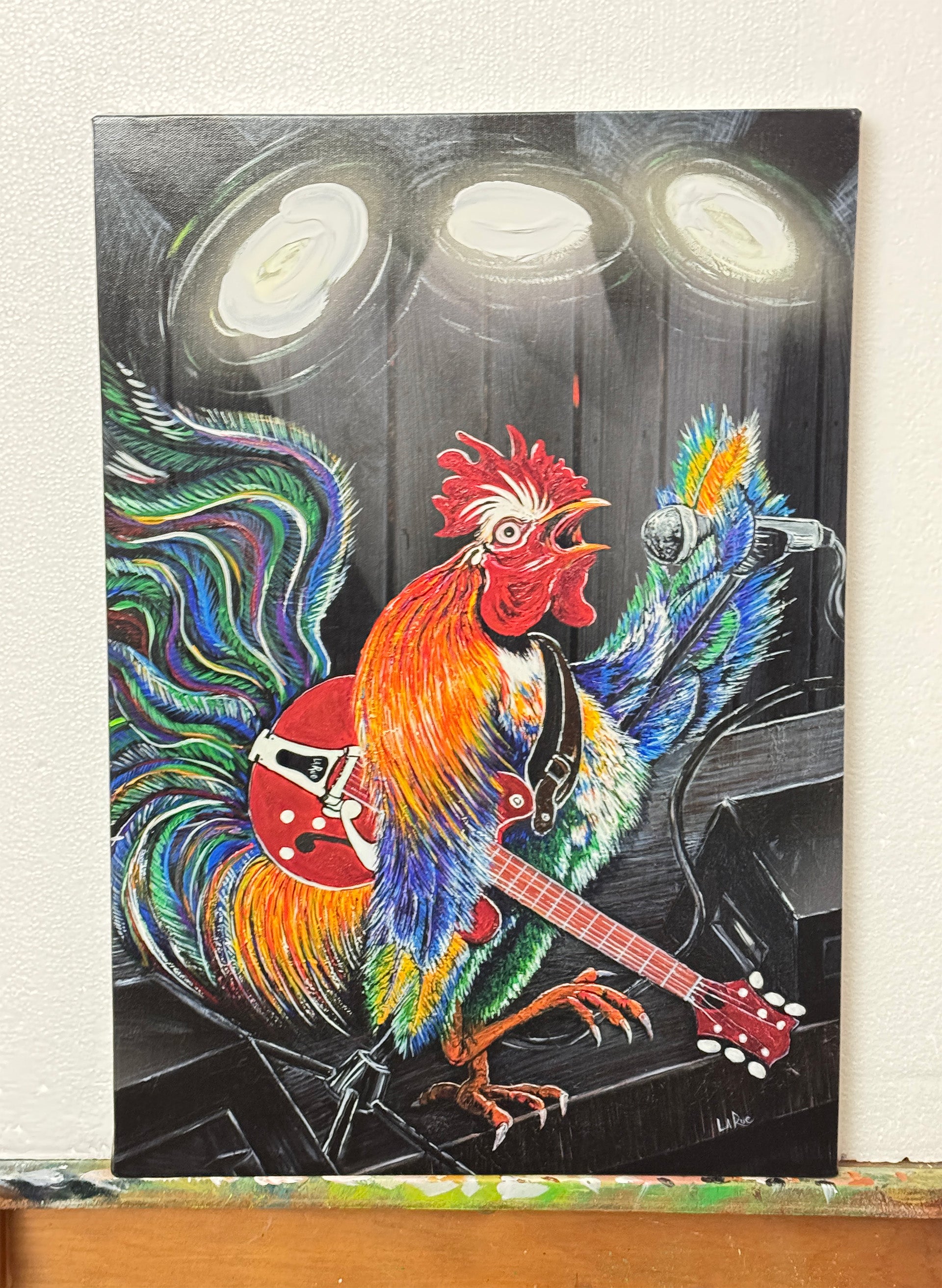 A result of having a friend who owned a live music venue called The Roost. Guitars, microphones and stage monitors help this singing rooster crow. This cocky lead singer struts his way across the stage strumming his guitar and crooning in the spotlight.